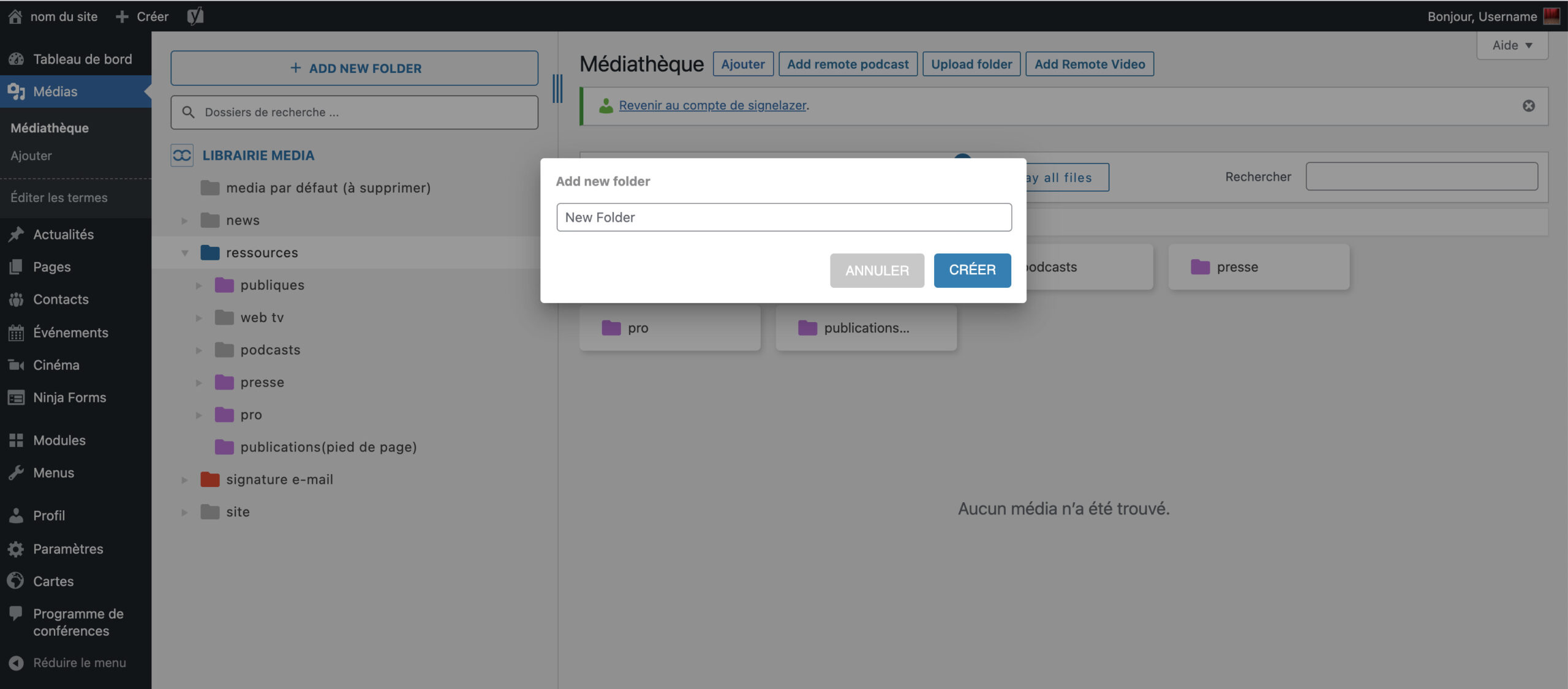 – Ressources regroupe les médias affichés dans la librairie. Il est composé de dossiers publics et de dossiers privés qui nécessitent un mot de passe.