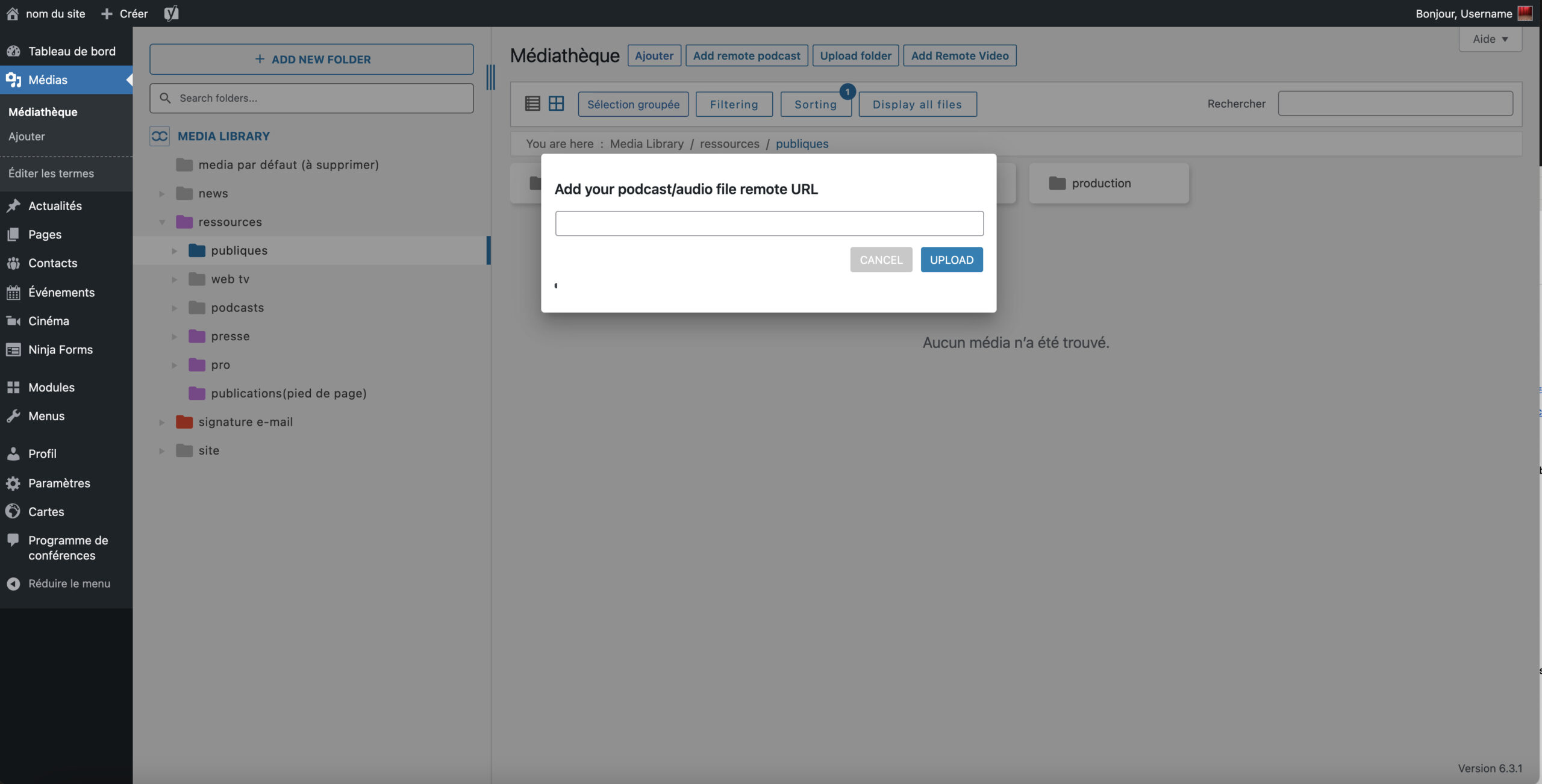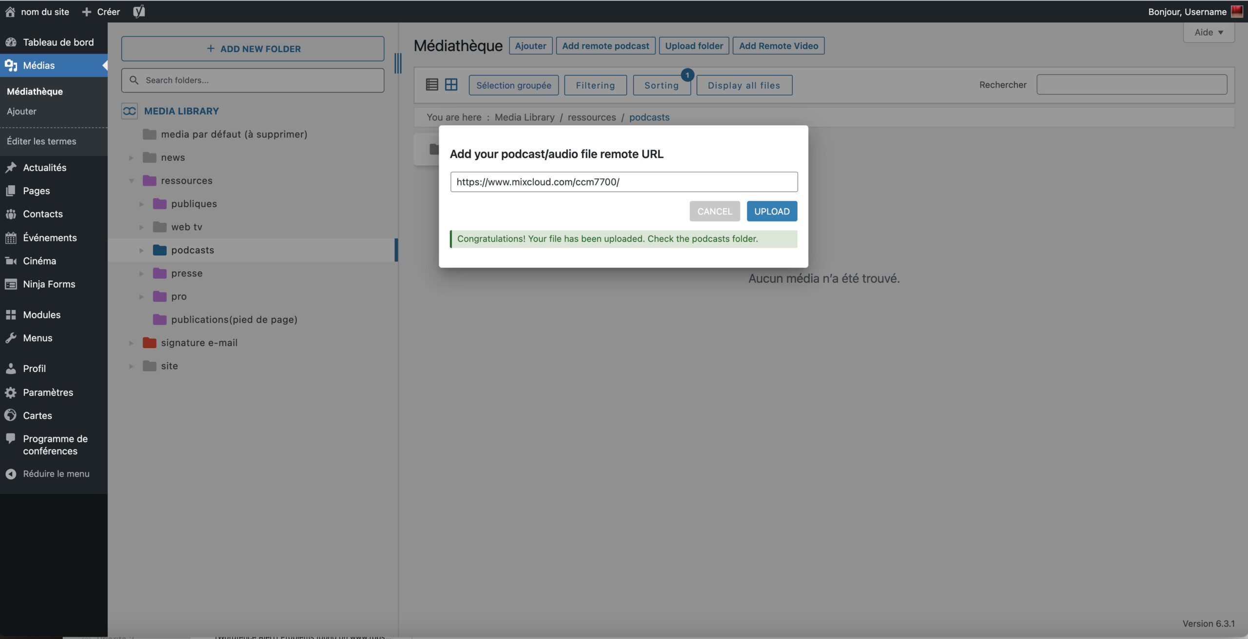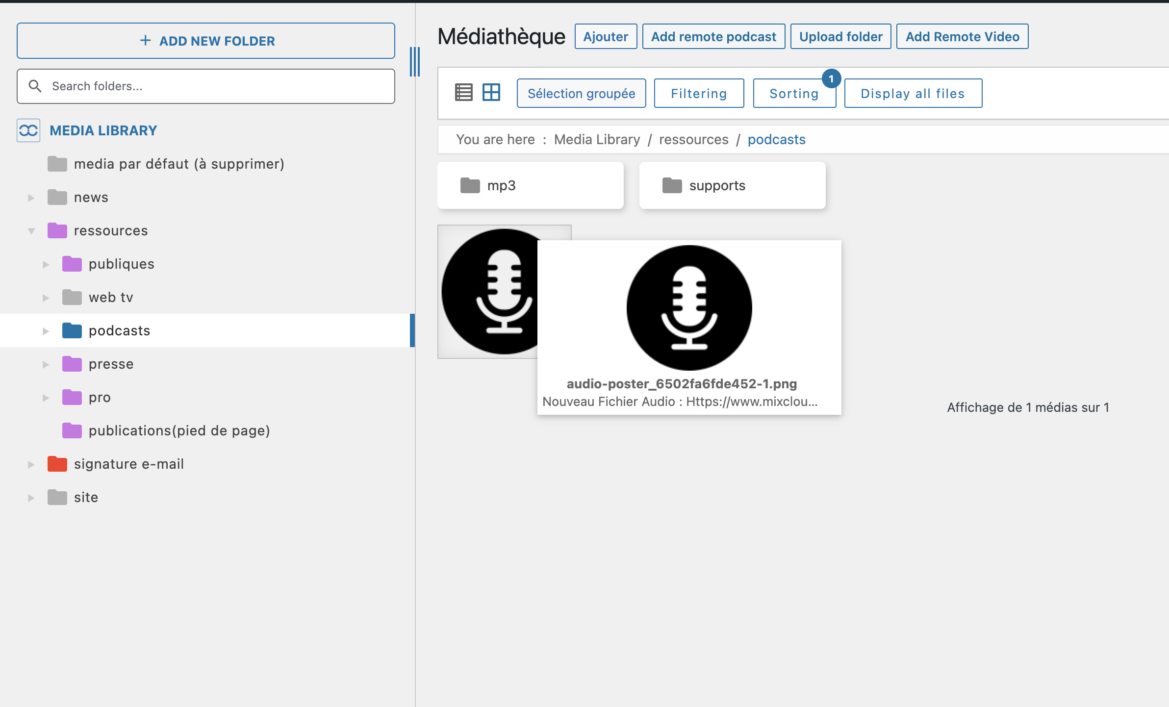 Retourner ensuite dans le dossier « podcast » où le podcast est désormais disponible. Si vous ne le voyez pas, rafraîchir la page :